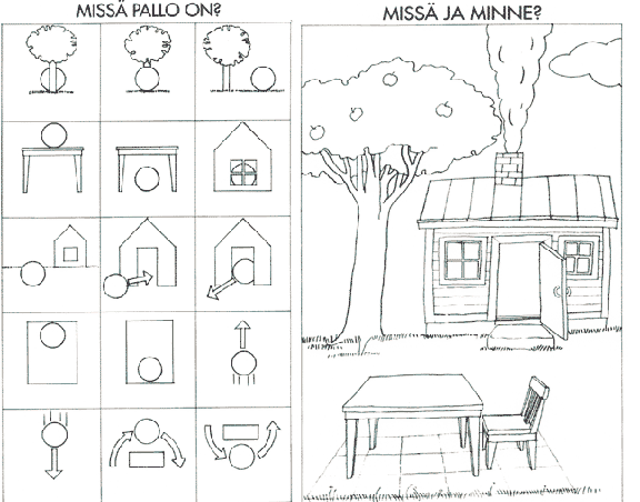 pallo pöydän alle; piirrä auto puun taakse, jne.